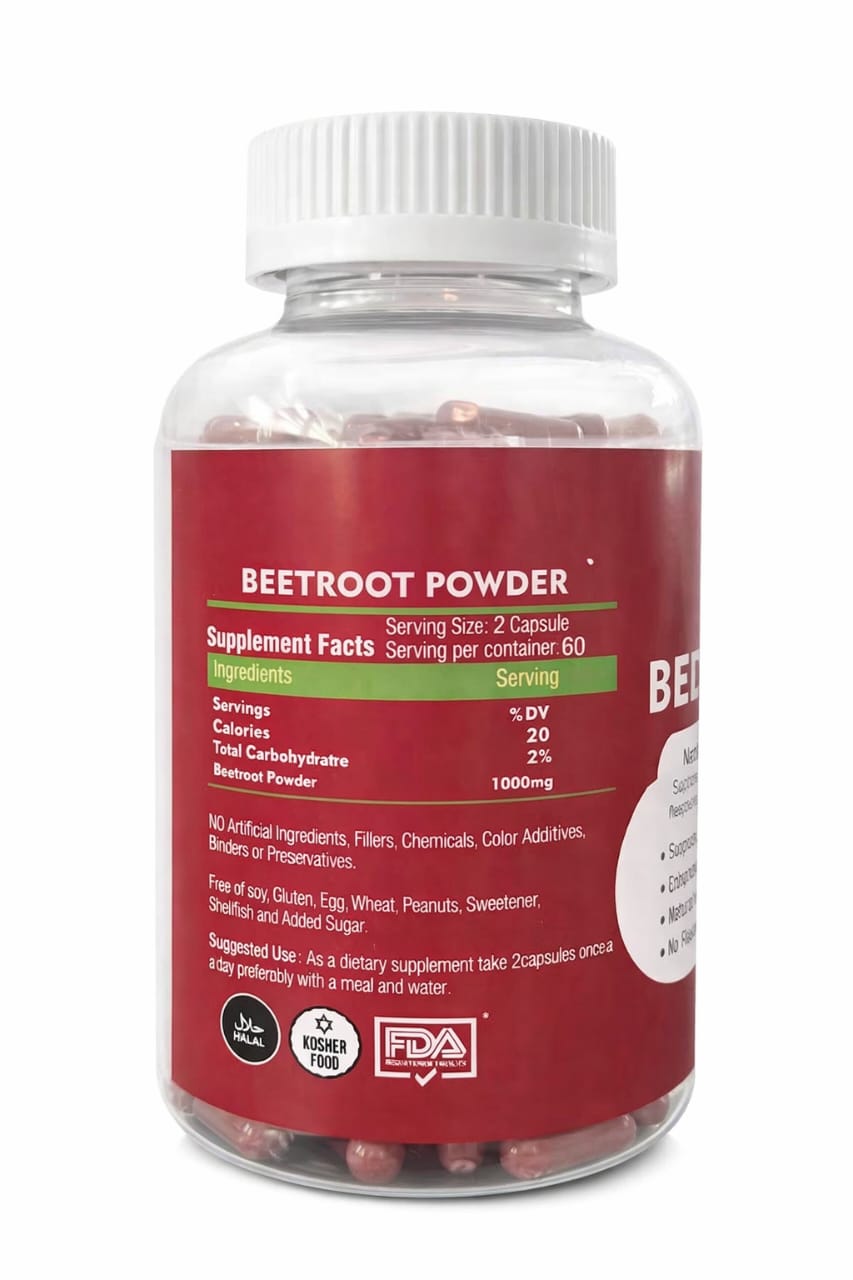 Boost your energy naturally with Beetroot Capsules 500mg. Made from premium beetroot extract to support blood pressure, stamina, heart health, and daily vitality. Easy-to-swallow capsules for men & women. 120 capsules for long-term use.